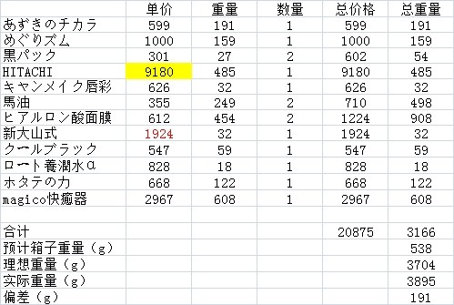 之前在日淘攻略看到很多人都有提起amazon是会标注商品的発送重量,只要把所有要买的东西的重量简单相加即可,没有任何的技术含量,大家如果想省钱就要勤快点。推荐excel制表,利用内置表格计算功能,可以很大的节省人力物力,购物列表调整起来也比较容易,还可以随时把过去的订单中的数据拿来直接用,不会用的建议学一下,很多的情况都可以使用的,不会日语的亲还可以多列一列中文名,以后可以快速查找对应的中日文。